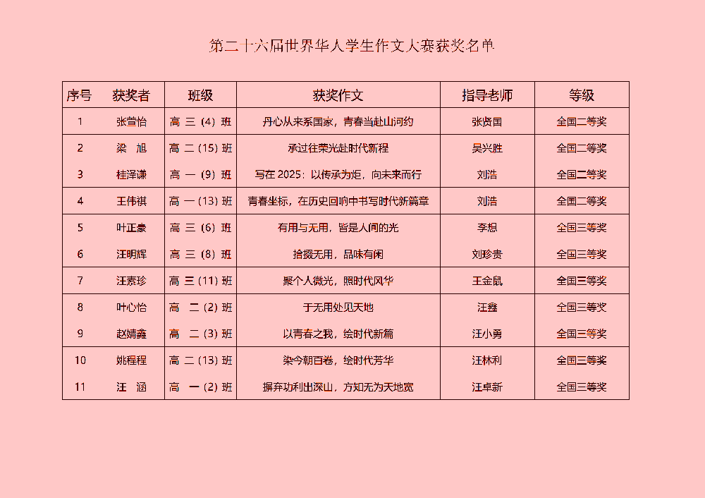 第26届世界华人作文大赛我校斩获佳绩